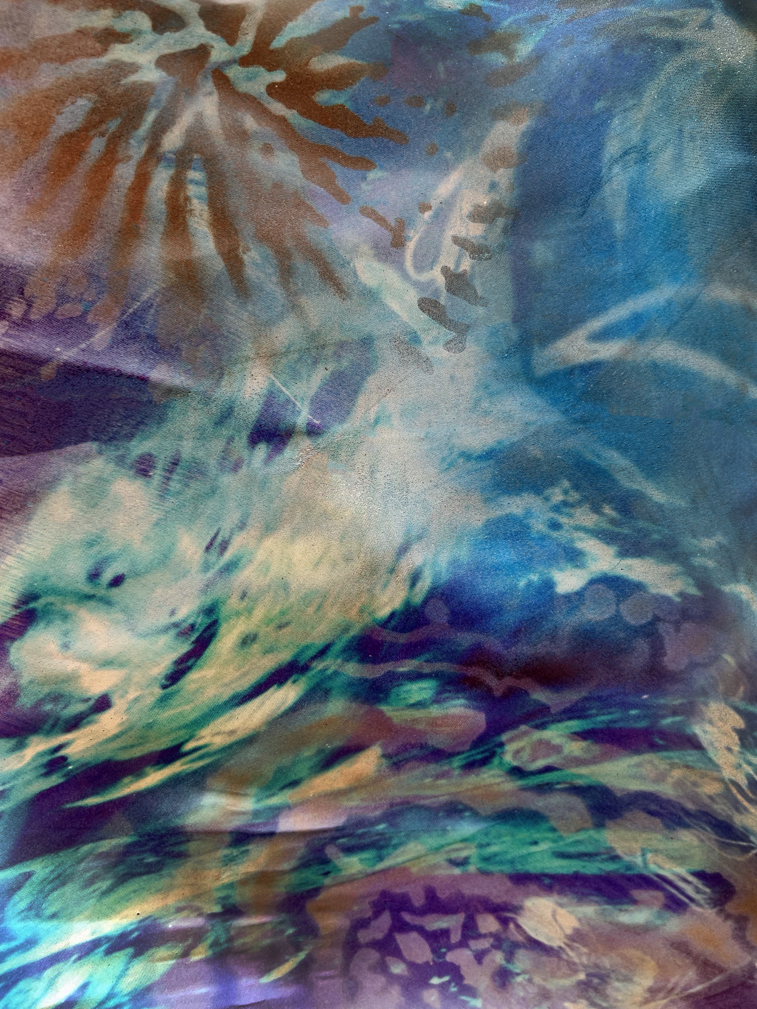 fig. 2. hand painted skirt, hand knitted sweater, croched raffia bra, satin headscarf, gradient tights, lace clogs
